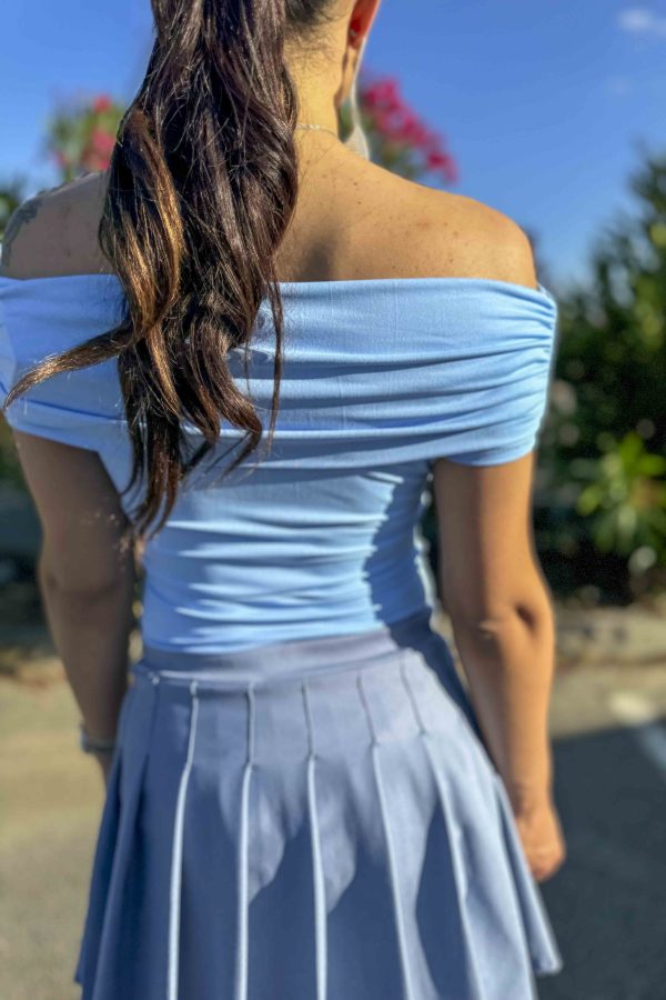 Body attillato in tessuto morbido a fascia, spalle scoperte.